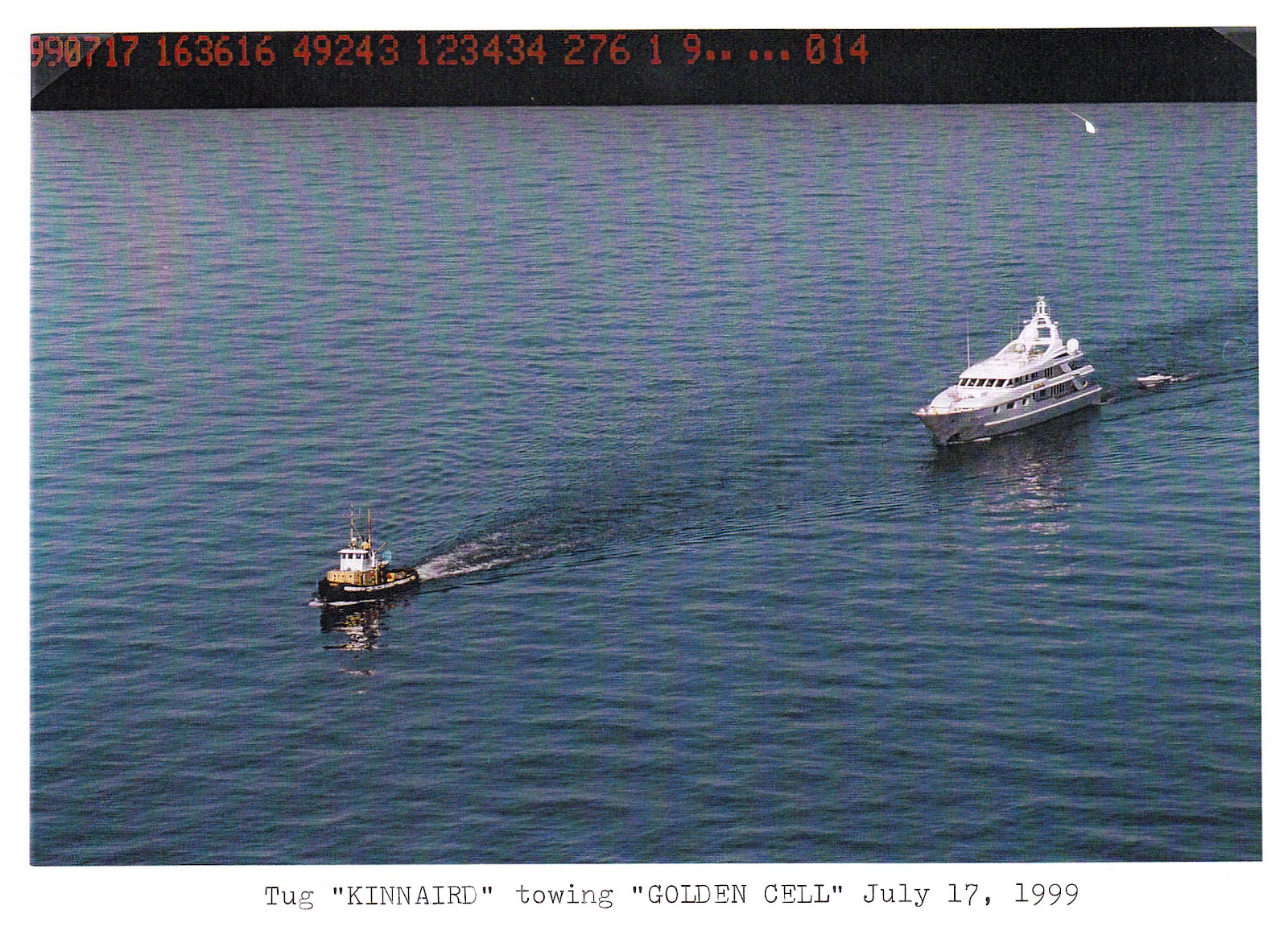 It was just around 1130 , on a beautiful summer night. A thick black tow cable was strung out to the bow of the yacht. Crew members on the tug and yacht were appointed their places to look for any signs of trouble. Kevin manned the controls of the bigger tug... the one that would make the pull. Kevin eased the tug into position to pull the large yacht free of the rocks and in to open water. Not an easy task with the nearby rapids pushing on the side of both boats. The line tightened....it was now or never. It pulled tight, you could see the diameter of the tow rope get smaller as it strained and stretched. More engine revs...more black diesel smoke.