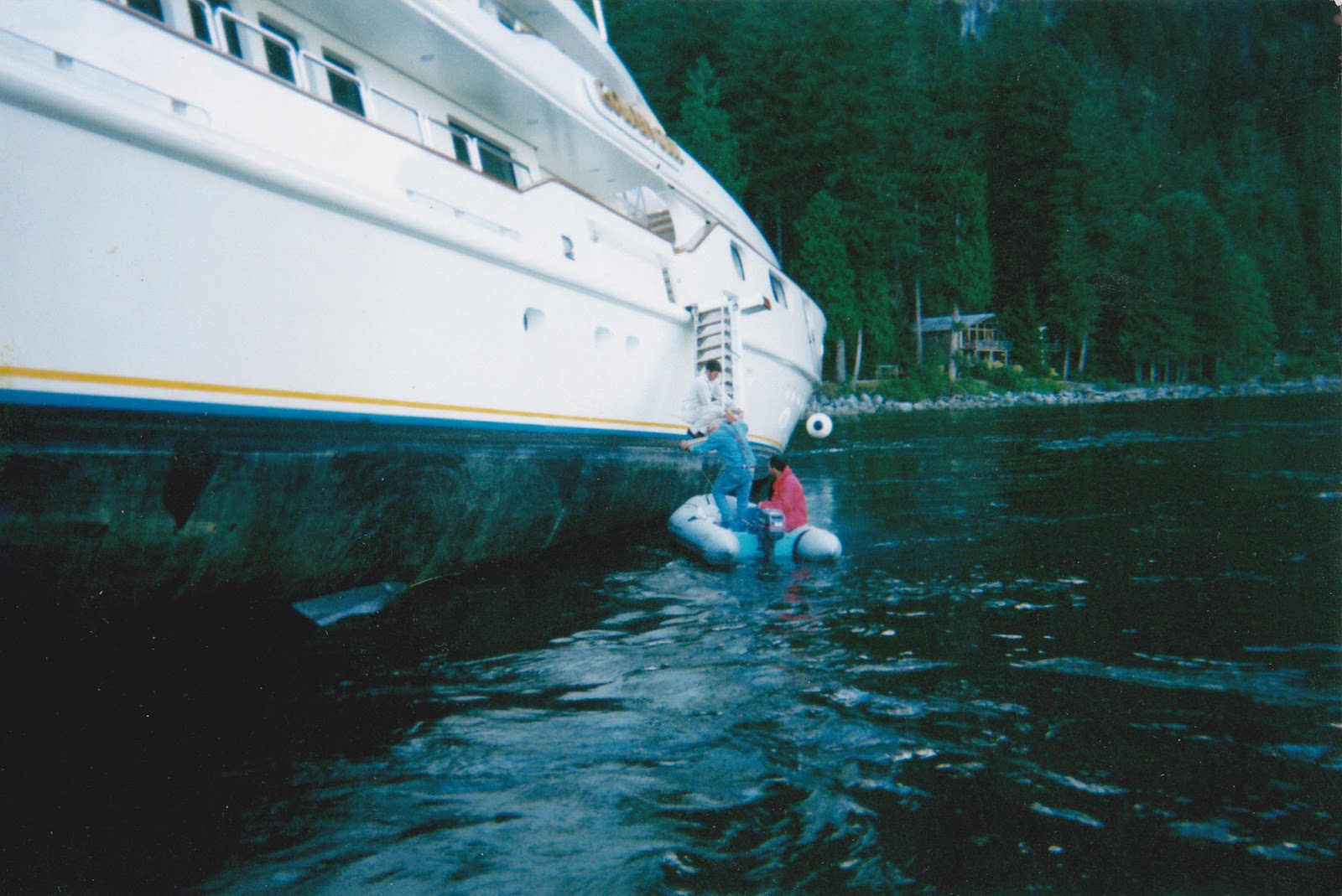 I talk gibberish to my sleepy girlfriend about yachts, tugs and airplanes and how I have to leave right away...and bail out into the night. I drive up to Secret Cove Marina, to gather my dive gear and work clothes...I gotta admit there's a bit of an adrenaline buzz happening...I don't think I'm a true adrenaline junky in the strictest sense, but I do love the odd jolt now and again.It doesn't take long and it's time to head into town towards the float plane dock. On the way, I make a decision that was one of the better ones in my life. I stopped in at BigMacs corner store to get a disposable camera ( pre-digital days)..this move would be a valuable one.