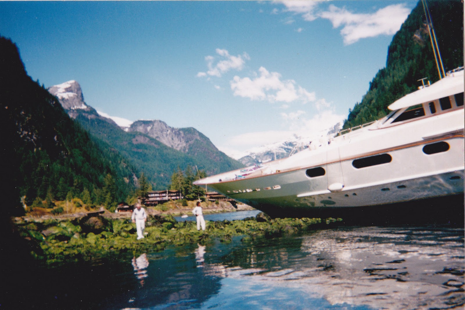 By the time we got there, the tide had gone out...way out. The yacht named the Golden Cell had gone aground at around midnight at high tide. Apparently a dispute in the wheelhouse over go or no go through the rapids in the dark between the owner and skipper had resulted in the accident. Not realizing that they were already at the edge of the rapids in the dark...the boat drifted backwards during the wheelhouse debate. The skipper looked out the windows and saw the Malibu lodge lights going the wrong way and realized that he was in trouble. Wisely he threw the drives into neutral to stop the props from turning. He knew from the charts that he was now only seconds away from an underwater boulder field. The skipper had the luckiest grounding possible in that area and settled up against a huge very smooth rock...surrounded, but not touching all of the hull tearing boulders that encircled them. It turns out that the owner, rumored to be a Mexican billionaire, had loaded his family and assistants onto chartered float planes and left the yacht in the able hands of the skipper.