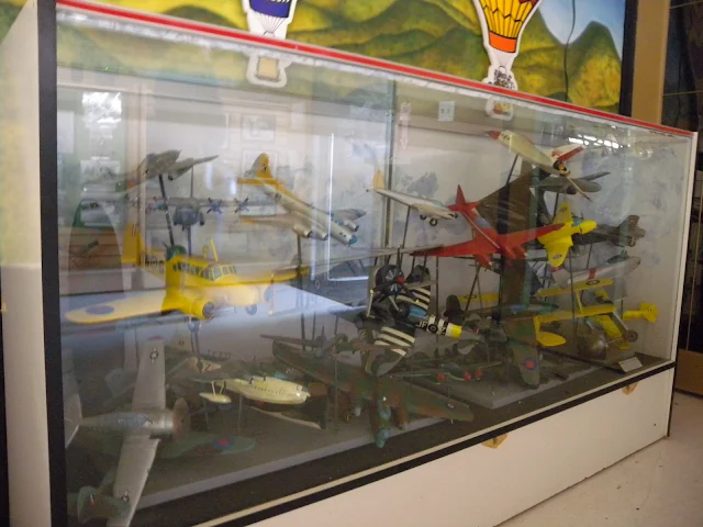 Full size old planes that are still flyable, sit beside radial and "V" engines of yester-year. Above them are huge and intricate models...some or most of them used to be remote control airplane models.